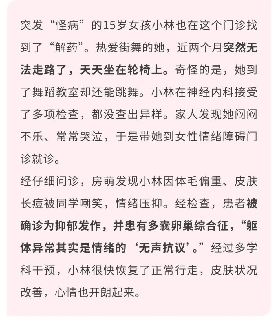 出诊的主任医师房萌介绍,该门诊接诊患者中青春期、围产期、围绝经期三大特殊阶段女性占比最高,不少患者辗转多个科室无果,最终才发现是情绪与躯体双重失调。