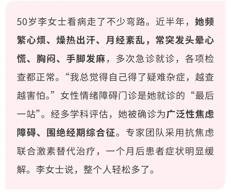 房萌介绍,青春期女性易因学业压力、内分泌波动出现焦虑抑郁、月经不调;围产期女性受激素、家庭关系影响,情绪波动大,还存在孕期用药安全顾虑;围绝经期女性常被焦虑失眠、潮热盗汗等问题困扰。单一科室往往难以兼治,需要多学科心身同治。她提醒:女性出现不明原因心慌胸闷、月经紊乱、长期失眠、情绪低落时,不要只反复检查躯体状况,可及时到女性情绪障碍门诊就诊。