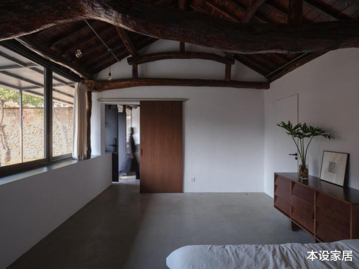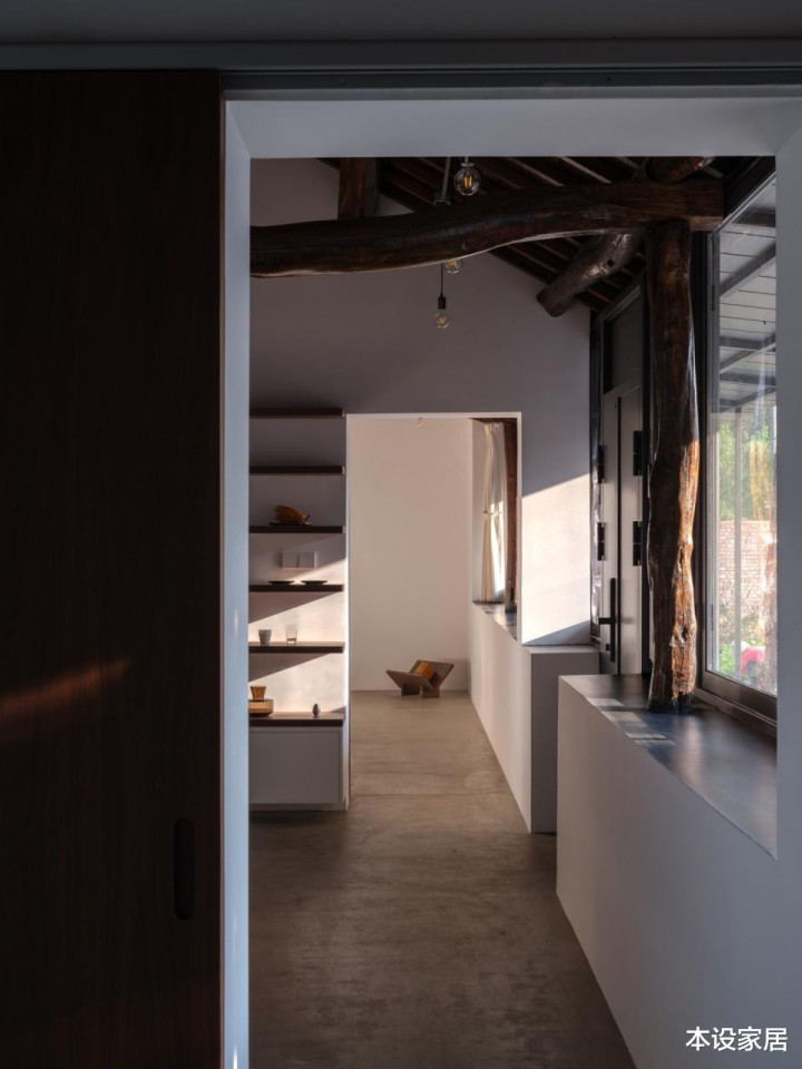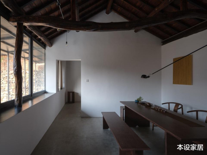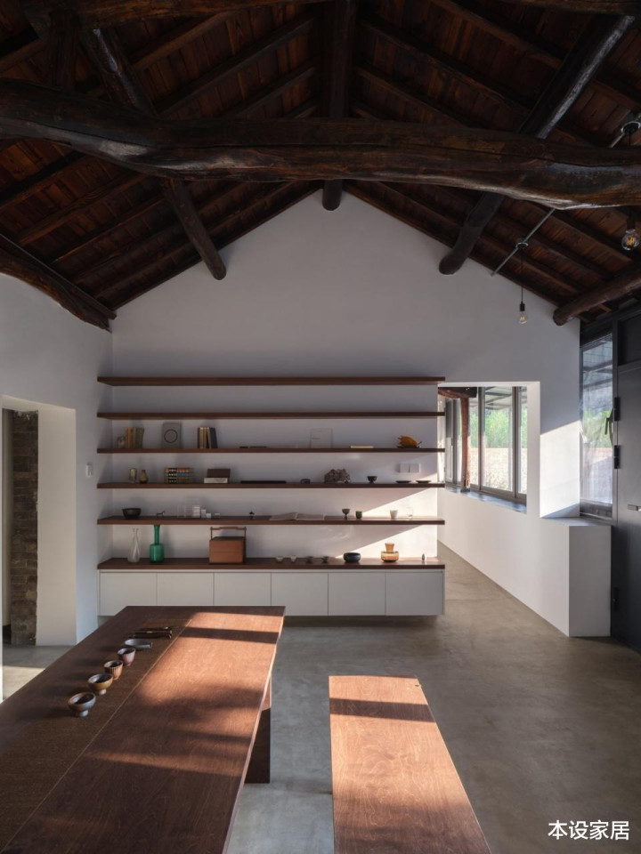 起居室的设计可以说“新旧共生”,地面做水泥自流平,墙面刷白色乳胶漆,与原有的深色原木梁柱形成强烈的对比,搭配造型简约的实木长桌与长凳,赋予空间历史温度的同时,也营造出沉静质朴的氛围。