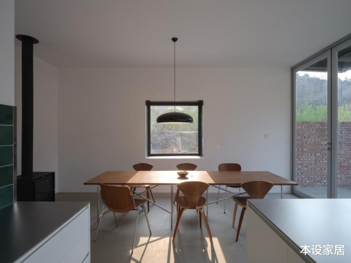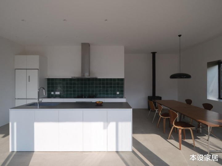 由于是新建的房子,融入更多现代元素,白色的橱柜和实木餐桌椅进行搭配,并以墨绿色瓷砖背板做点缀,简约中透出沉静质感,而大面玻璃推拉门,引入庭院景观与自然光线,让整个空间更加通透。