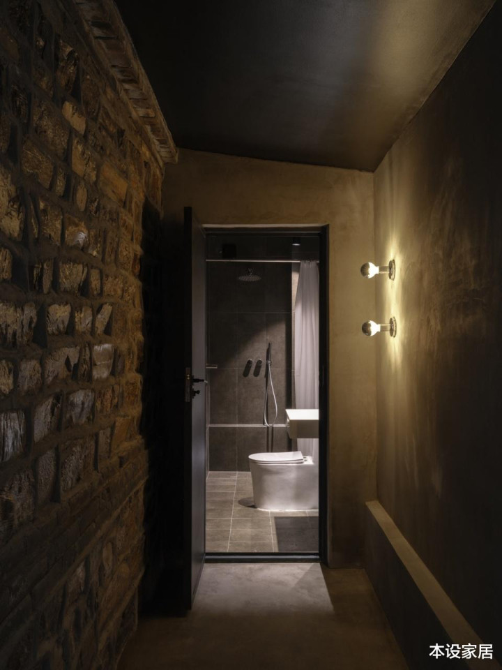 墙地面铺设丰富肌理的灰色砖,搭配白色洁具,在材质碰撞间,流露出原始质感与当代设计的平衡之美。